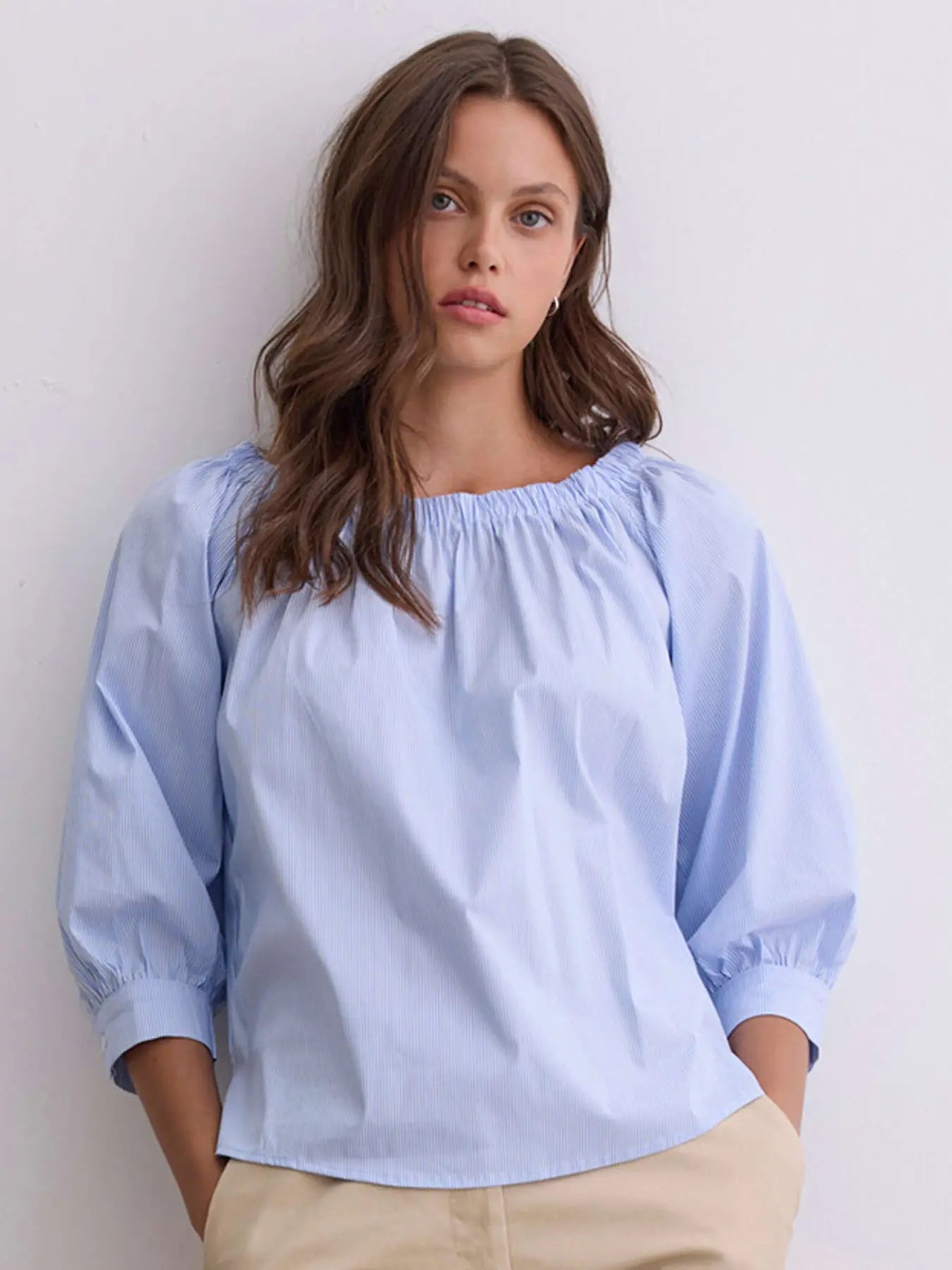 חולצה אלגנטית לנשים בגזרה ישרה, תפורה מבד כותנה יציב ונעים למגע. פסים תכלת־לבן עדינים, פתח צוואר סירה עם כיווץ אלסטי, ושרוולי בלון באורך מרפק עם סיומת כפתור.